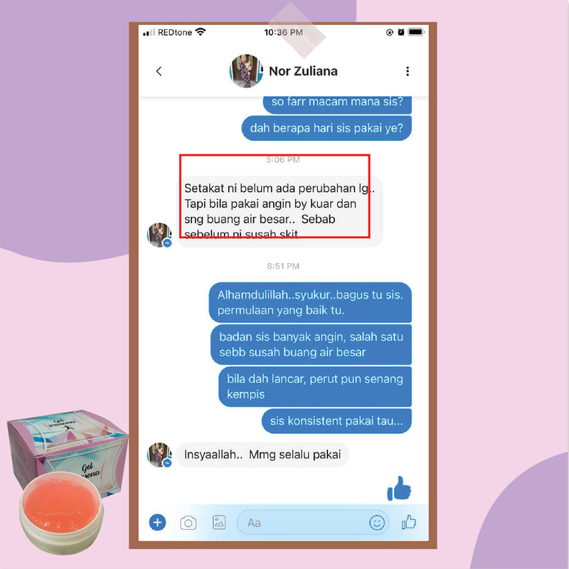Bila pakai Gel Persona ni, banyak angin keluar dari badan.